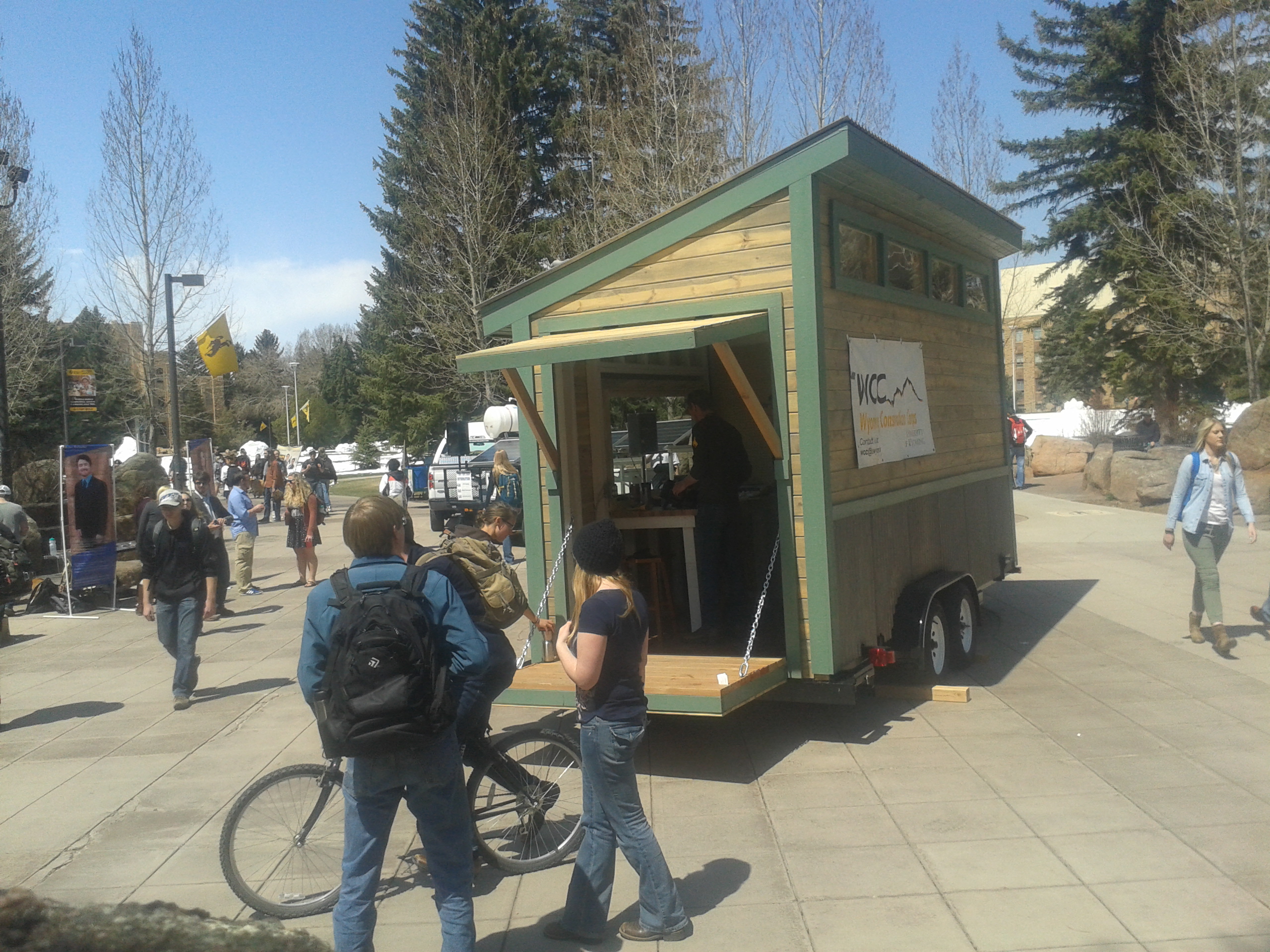 Earth Day April 22, Laramie WY – The WCC exhibited the tool cache in the center of campus. Thanks to the hard work of the crew leaders and Paul Pellissier, we have a tool cache now ready to populate with tools and organization. Paul is now building another tiny house for Laramie and open for future business. Check him out at Timbercraft Woodworks