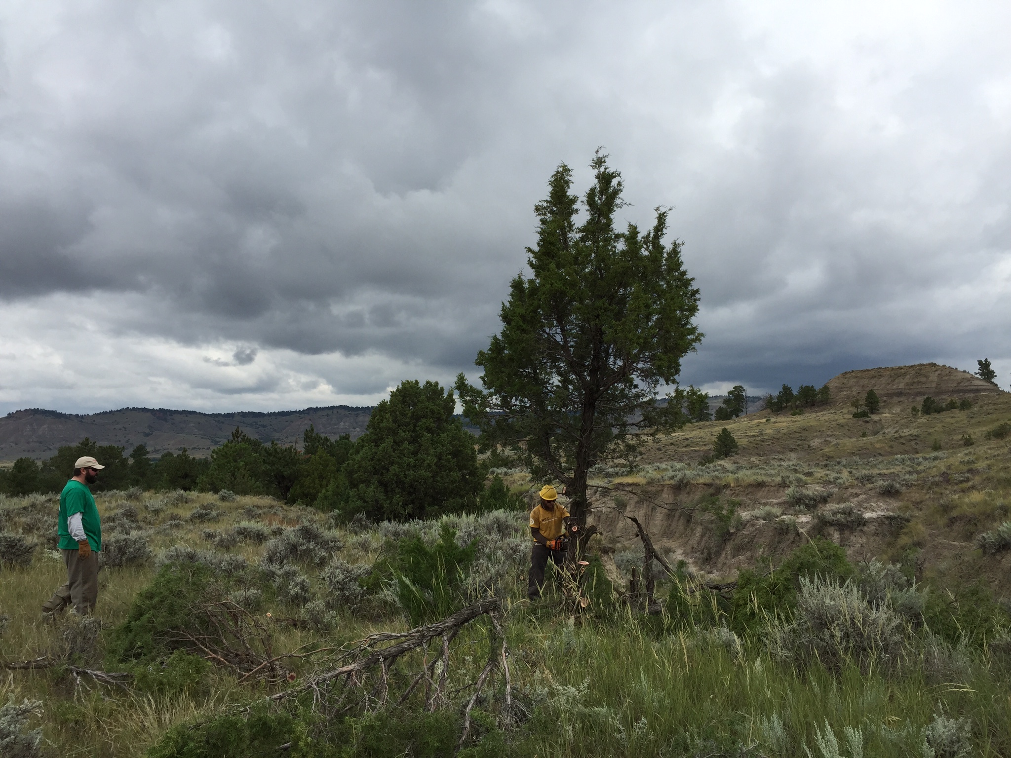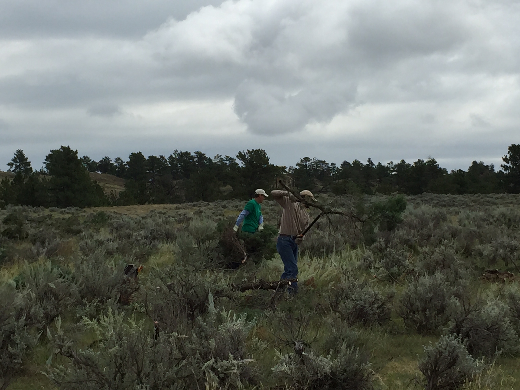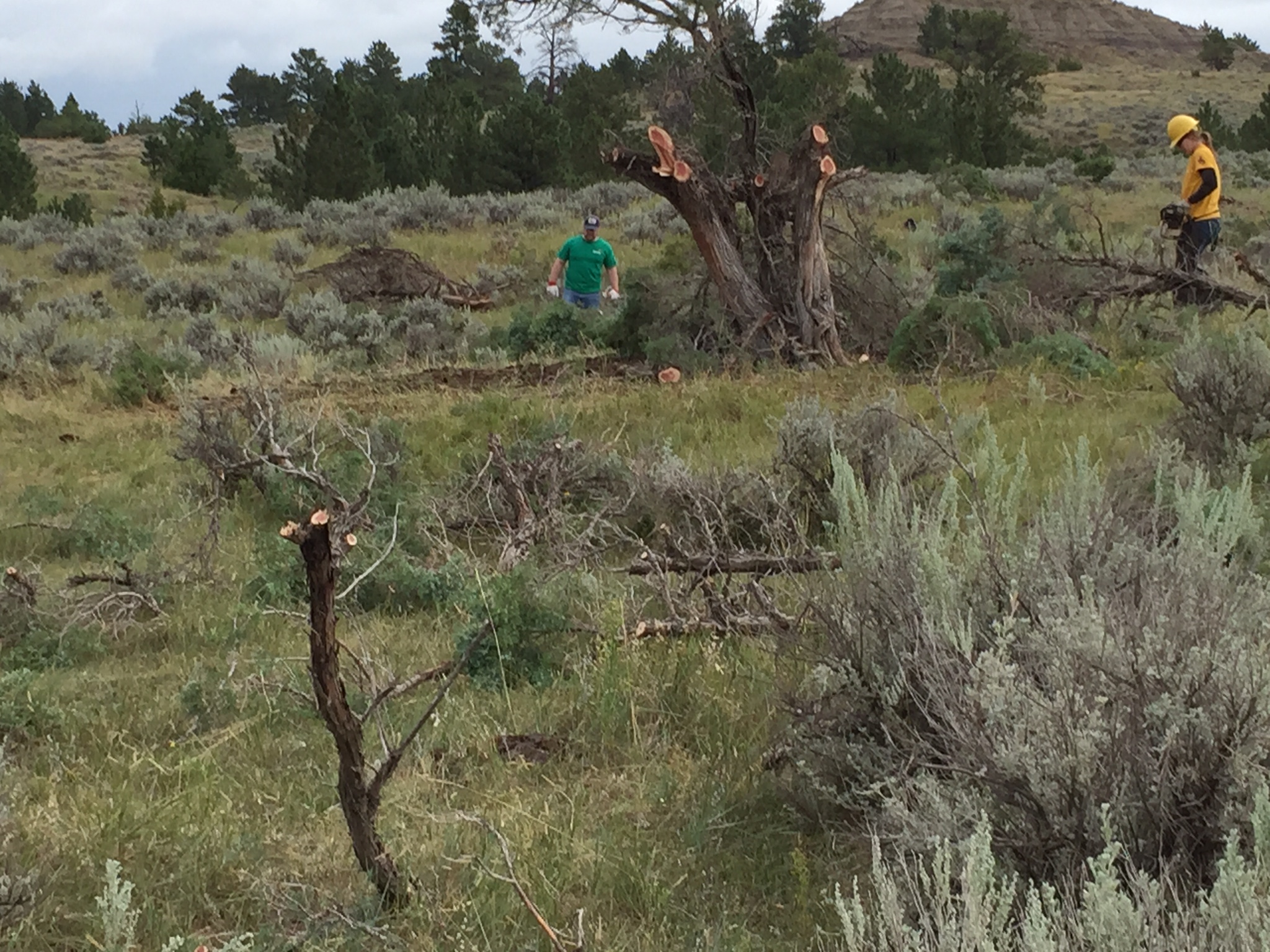 BURNT HOLLOW Management Area, 20 miles of Gillette on Highway 59, August 18, 2015 – Over the last seven years, Devon has partners with WCC in projects all over the state but this project in particular is indicative of the progressive streak held in Devon Energy’s values. This ongoing project is dedicated to the enhancement of sage grouse habitat, a project heavy on many people’s minds who live in the western states. On August 18th, Devon volunteers from their Wyoming field offices and from their headquarters in Oklahoma City, Oklahoma came to help the WCC team by carrying brush away from our chainsaw crews as well as removing the juniper by hand. In the Brunt Hollow area, the project was to remove all the juniper which has become invasive in the area out competing all other woody species and depleting the sage brush so vital to the grouse’s survival. With 30 volunteers or more, in just a few hours, the area was near to being totally rid of all the low elevation juniper we were targeting. That’s pretty amazing! Thank you volunteers!